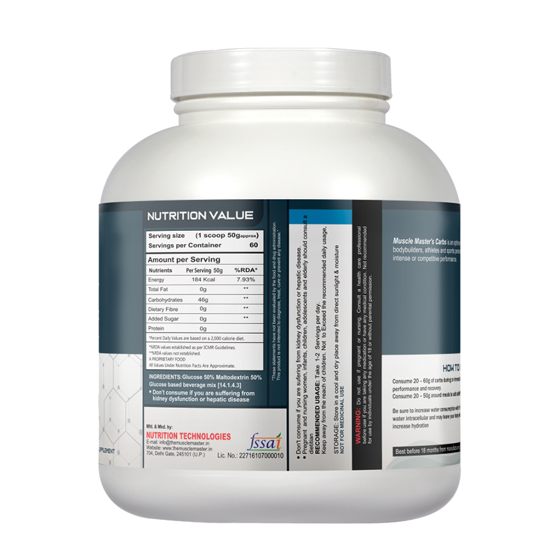 Muscle Master's Carbs is an optimum source of calories and energy for bodybuilders, athletes and sports person who wants to avoid fatigue during intense or competitive performance.