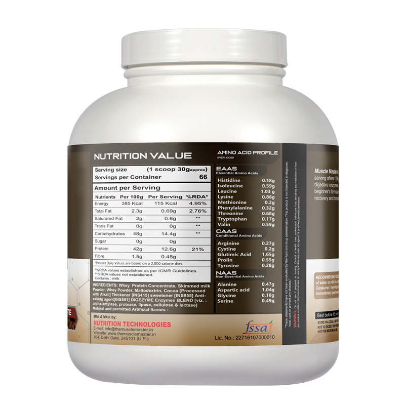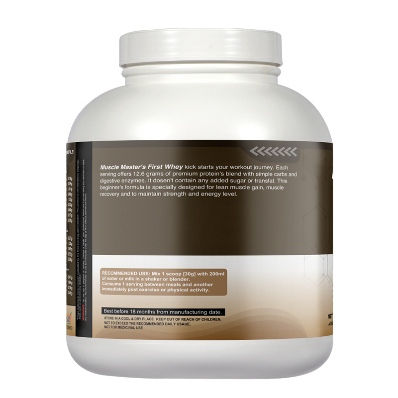 Muscle Master's First Whey kick starts your workout journey. Each serving offers 12.6 grams of premium protein's blend with simple carbs and digestive enzymes. It dosen't contain any added sugar or transfat. This beginner's formula is specially designed for lean muscle gain, muscle recovery and to maintain strength and energy level.