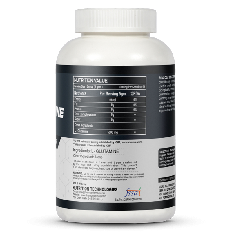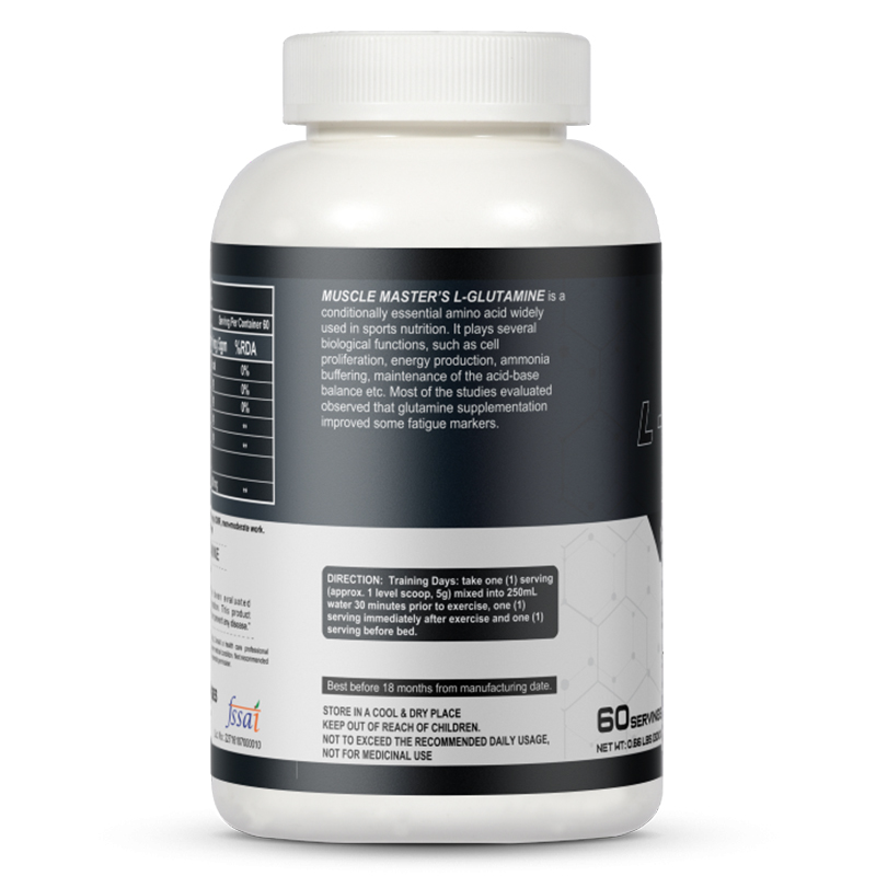 MUSCLE MASTER’S L-GLUTAMINE is a conditionally essential amino acid widely used in sports nutrition. It plays several biologi cal func tions , such as cel l proliferation, energy production, ammonia buffering, maintenance of the acid-base balance etc. Most of the studies evaluated observed that glutamine supplementation improved some fatigue markers.